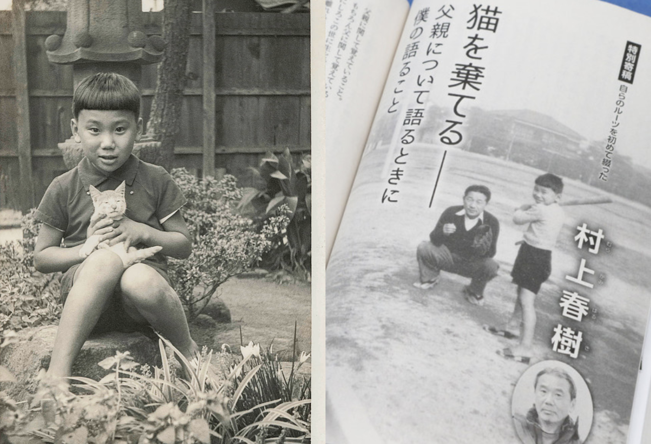 그리고 작년 9월 하루키를 미국에 처음 소개해준 <뉴요커>지에 전문이 실리게 됩니다. 번역은 역시 하루키의 영어 전문 번역가인 필립 가브리엘 교수가 맡았습니다. 이 기사는 지금도 뉴요커지 웹 기사로 읽을 수 있는데, 이 기사의 종이 신문 버전에는 하루키 팬들에게는 깜짝 놀랄 만한 사진이 실리기도 했답니다. 바로 하루키가 두 발을 가지런히 모아 고양이를 조심스럽게 들고 있는 사진인데, 고양이를 얼마나 아끼고 친구 처럼 지냈는지 단번에 알 수 있는 사진이랍니다. 지금까지 언급된 2개의 사진을 한 번에 모아 봤습니다. 평온하고 부족함이 없는 가정에서 사랑 받으며 자랐다는 것이 사진을 통해서 묻어 나오는 것 같죠.