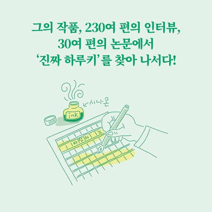 하루키의 작품과 일상 속 스팟을 찾아 떠난 여행기인 <하루키를 찾아가는 여행>이 나온지도 벌써 10년이라는 시간이 지났는데요. <1Q84>가 출간된 2008년 하루키에 대해 증폭되는 궁금증에 전 세계 인터뷰를 찾아 보며 하나 하나 파헤치기 시작했고, 그 노력들을 파인딩 하루키 블로그를 통해 15년간 쌓아왔습니다. 하나 하나 알아갈 때 마다 기쁜 마음에 블로그를 방문해주실 여러분들에게 공유하며, 또 다른 영감을 드리고 하루키의 문학을 이해하고 더 알고 싶어하는 모든 분들의 갈증을 조금이나나 해소해왔다고 생각합니다.