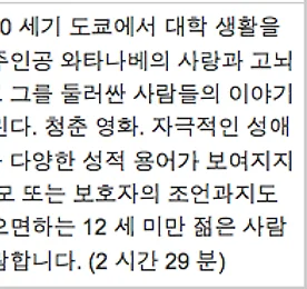 영화 썸네일형 리스트형 하루키를 찾아 떠난 여행 Day3: 고베(4) 지난 3~4월간 다녀온 프로젝트 '파인딩 하루키' 여행. 10번째 포스팅은 고베 마지막편입니다. 하루키의 학창시절 추억이 많이 서려있는 고베, 산노미야를 둘러 보고 있습니다. 고베 마지막편 시작할게요! *여행간 트위터 중계(클릭) 파인딩 하루키 Part 1; 간사이Day 3: 고베(4)전편에서 둘째날의 루트를 그대로 따라갔습니다. 고베고등학교에서 산노미야역, 그리고 피자하우스 '피노키오'까지 봤죠. 은 거기에서 마무리가 됩니다. 파인딩 하루키 고베 마지막편에서는 하루키 여행법에 등장하지 않는 하루키와 관련된 장소를 더 가보도록 할게요. 드디어 고베 마지막날입니다. 하루키가 피노키오의 958,816개째 구워진 피자를 먹었던 피자 하우스 피노키오에서 나오니 비가 내리기 시작했습니다. 우산을 펴고 언덕을 내려.. 더보기 하루키 원작 <상실의 시대; 노르웨이의 숲> 일본 관객의 평가는? 트란안홍 감독이 4년간의 기다림끝에 하루키의 결심을 받아내고 공개를 한 무라카미 하루키 원작의 이 일본에서 지난 12월 22일 개봉 했습니다. 원작자 하루키의 모교이자 영화 로케지인 와세다 대학에서 일본 프리미어 시사를 시작으로 일본 전국 312개의 상영관에서 개봉을 하였고, 개봉 2일간 13만2천명을 동원하여 같은 주 개봉 영화 중 3위로 시작했는데, 2주차 3위, 3,4주차 6위에 랭크된 이후 현재는 10권 내에서 벗어난 상태입니다. 일본 내에서는 크게 입소문을 타지 못한채 하루키 매니아층을 중심으로 관람이 이어지는 듯 보이고요. 영화는 가장 열성적인 하루키팬을 보유하고 있는 대만을 시작으로 세계 각국에서 개봉을 이어가고 있으며, 국내에도 4월에 개봉이 잡히기도 했습니다. 보지 않을 수 없는 영화 너.. 더보기 하루키 원작, 영화 <상실의 시대; 노르웨이의 숲> 일본 CF 모음 무라카미 하루키 원작 이 일본에서 12월 11일 개봉했습니다. 하루키의 모교이자, 소설, 영화 속에서 등장하는 기숙사 등의 로케를 허락해 준 와세다 대학에서 일본 프리미어를 갖고, 티셔츠 부터 케익까지 정말 다양한 영화 관련 프로모션을 진행하며 한창 관객 몰이를 하고 있습니다. 얼마전 각국의 재일 외국인들을 초청해 전세계 50개국 개봉 이벤트를 하기도 했었죠. 해외 개봉 1순위는 역시 가장 많은 하루키 팬을 거느리고 있는 대만이었고, 17일 프리미어 행사를 가졌네요. 한국 개봉도 빨리 이뤄지길 바라며, 일본 내 TV CM 5종 셋트를 감상해 보시죠. ^^ *일본 내 평론가들의 트란안홍 감독의 에 대한 평가는 따로 포스팅을 마련하겠습니다. CF 1. 드라마편. "사랑했던 것을 놓친 슬픔은 잊을 수 없다",.. 더보기 하루키 원작, 영화 <상실의 시대; 노르웨이의 숲> 본 예고편 공개 올해로 67번째를 맞는 베니스영화제에 미이케 다카시 감독의 과 함께 공식 경쟁 출품작으로 진출한 하루키 원작, 트란안홍 감독의 이 9일 베니스 영화제에서 월드 프리미어를 갖고, 일본 내 본격적인 홍보 활동을 준비하며, 1분 30초의 본 예고편을 공개하였습니다. 일본 국내 역대 최대 발행 부수 (올 해, 천만부를 돌파했죠), 유래를 찾을 수 없을 정도로 세계에서 많이 읽힌, 현대 문학의 최고봉이 영화화됐다는 문구로 시작합니다. 와타나베(NR): 1969년의 여름, 20살이 되려던 때 나는 사랑을 하고 있었고 그 사랑은 나를 복잡한 곳으로 데려갔다. 왜냐하면 나오코는 나를 사랑하는 것 따위는 하지 않았다. 이 곡을 듣고 있으면 깊은 숲 속에서 헤매고 있는 듯한 기분이 들어, 사랑할 것을 잃어버린 슬픔을 이겨.. 더보기 하루키 원작, 영화 <노르웨이의 숲> 티저 예고 공개 무라카미 하루키 원작, 트란안홍 감독의 티저 예고편이 드디어 공개되었습니다. 며칠 전, 영화에 이례적으로 비틀즈의 원곡 라이센스를 얻어 사용하게 되었다는 놀라운 소식 뒤에 공개된 영상이라 더욱 기쁜 일입니다. 비틀즈의 음악은 라디오 외에 어떤 매체에서도 사용하지 못하게 되어있죠. 소설 은 1권의 빨간 이미지로 고독과 상실을 표현하고, 미도리로 대표되는 2권의 초록색으로 삶의 재생을 표현했습니다. 홈페이지 역시 스타트 버전 부터 이 대비되는 이미지를 계속 사용하고 있습니다. 이번에 새롭게 재편되면서 멘트까지 추가되었네요. '강하게 사는 것', '깊은 사랑을 하는 것' '무라카미 하루키 원작, 트란안홍 감독, 조니그린우드 음악, 비틀즈 주제곡' '아름다운 영상과 하루키 언어의 절묘한 조화를 기대케 하는 티저.. 더보기 하루키 원작, 영화 <노르웨이의 숲> 일본 심의 결과는? 일본에서만 누적 천만부 판매의 대기록을 달성한 무라카미 하루키의 베스트셀러인 이 트란안홍 감독의 연출로 영화화되어 올 12월 공개를 기다리고 있는 가운데, 최근 일본 영상물 심의 위원회의 심의를 통과해서 영화에 대한 약간의 소스를 얻을 수 있었습니다. 일본 영화 윤리 위원회 http://www.eirin.jp/ 러닝 타임이 2시간 29분으로 감독의 영화 중 가장 길어, 역시 영화화는 그 도 힘들었을 수도? 하루키의 을 영화화했다는 것은 제작사에서도 기적이라고 표현할 만큼 놀라운 일이었습니다. 소설의 디테일하고 깊은 내면 묘사를 영상으로 표현해낼 수 있을지에 대